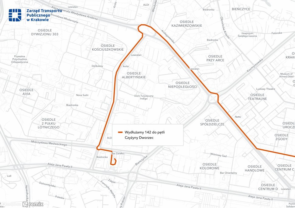 - Wydłużenie linii 142 z pętli Aleja Przyjaźni do pętli Czyżyny Dworzec, przywracając bezpośrednie połączenie dla mieszkańców rejonu ulicy Marii Dąbrowskiej z centrum Nowej Huty;