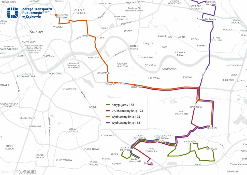 - Wydłużenie linii 163 z pętli Nowy Bieżanów Południe do pętli Miejskie Centrum Opieki, zapewniając w ten sposób bezpośredni dojazd z Nowej Huty do Szpitala Uniwersyteckiego w Prokocimiu;