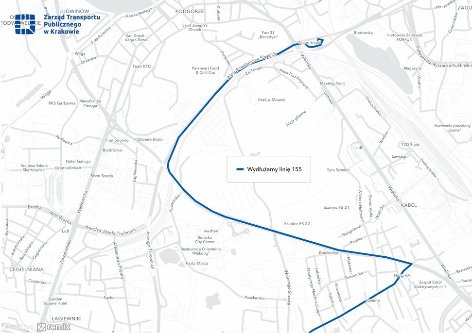 - Wydłużenie linii 155 przez ulicę Malborską, Kamieńskiego i aleję Powstańców Śląskich do dworca Podgórze SKA.