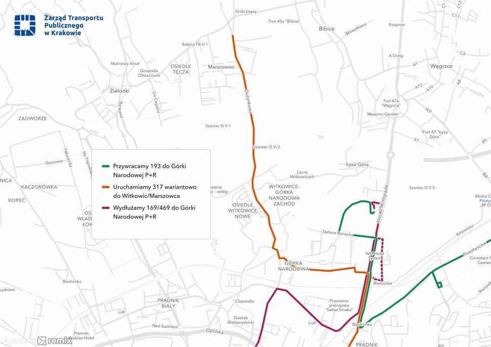 - Wydłużenie linii 193 z pętli Prądnik Czerwony do dworca Górka Narodowa P+R, przywracając bezpośrednie połączenie z rejonu Górki Narodowej i Osiedla Gotyk w kierunku Nowej Huty.