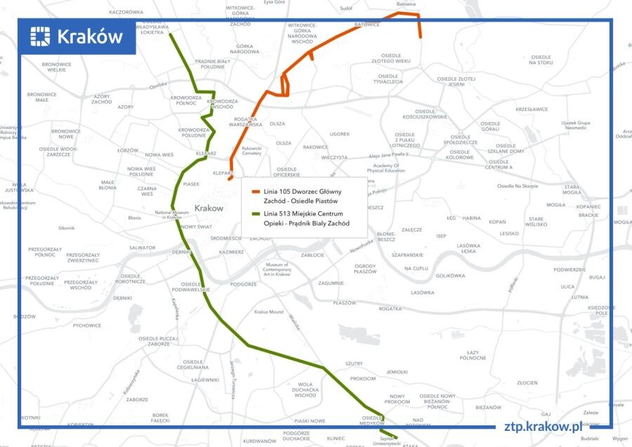 To nie koniec zmian w komunikacji autobusowej na północy Krakowa. ZTP zapowiada, że wkrótce linia nr 105 będzie kursować z „Dworca Głównego Zachód” do pętli „Osiedle Piastów”, a linia nr 513 będzie jeździć na trasie z pętli „Miejskie Centrum Opieki” do nowej pętli „Prądnik Biały Zachód”, która powstała w ramach budowy Trasy Wolbromskiej.