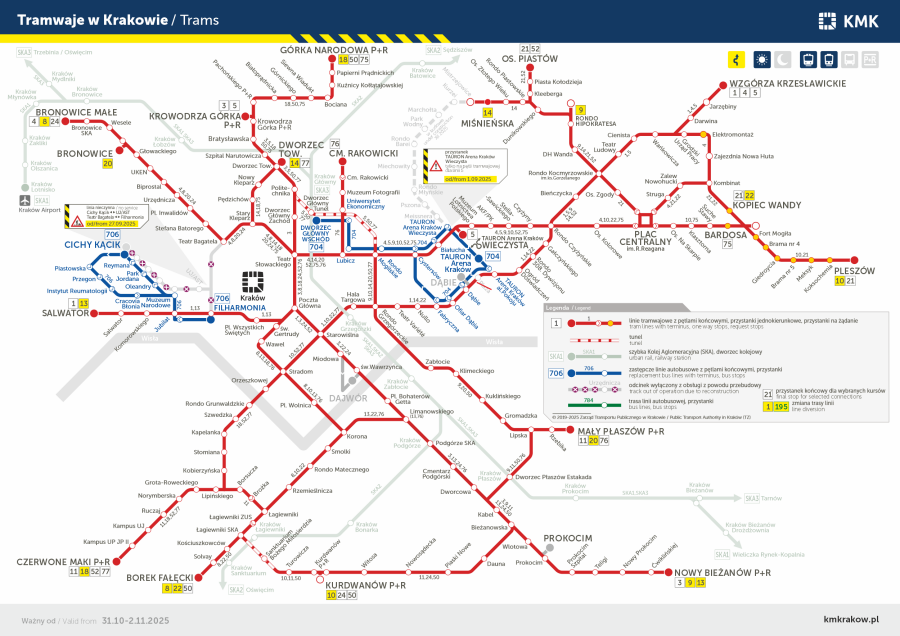 - W dalszym ciągu nieczynne będą przystanki tramwajowe: „Brożka” 02 oraz „TAURON Arena Kraków Wieczysta” 01 i 02