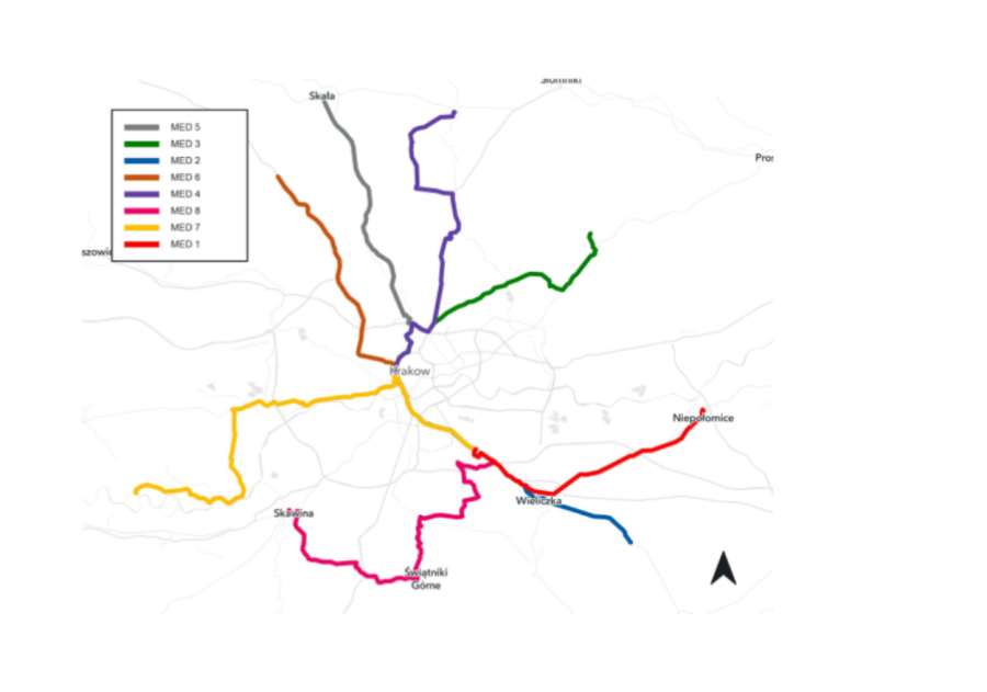 - Linia Medyczna 2 kursująca przez Trąbki P + R, Biskupice, Tomaszkowice następnie przez Wieliczkę do Szpitala Uniwersyteckiego / Instytut Pediatrii