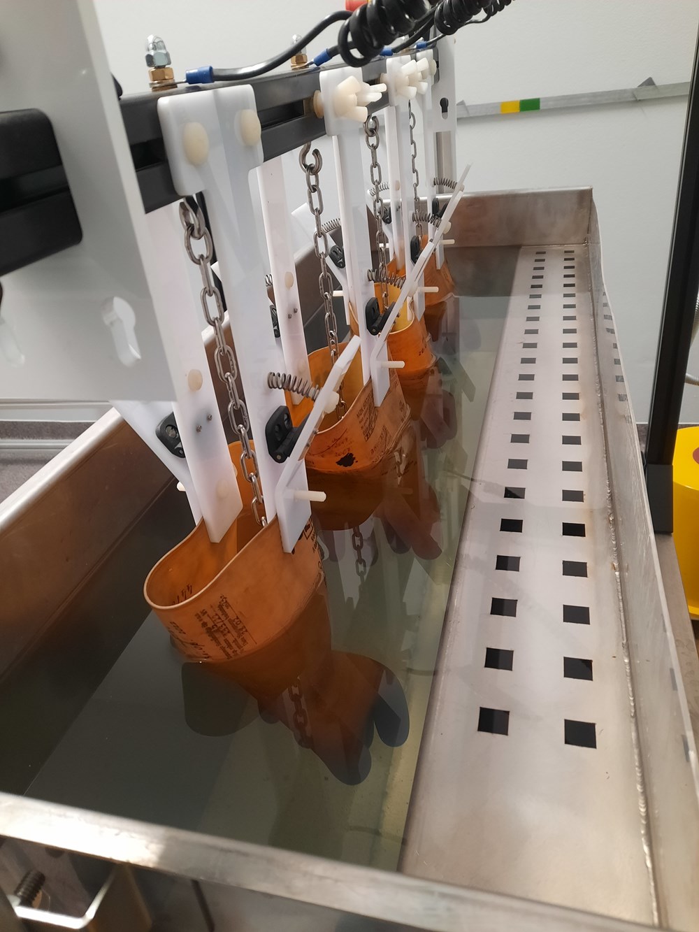 Laboratorium badawcze dysponuje odpowiednim wyposażeniem zapewniającym utrzymanie spójności pomiarowej. Sprzęt zanurzony w wodzie poddawany jest oddziaływaniu odpowiedniego napięcia przez określony czas i pomiarze upływu prądu, który nie powinien przekraczać pewnej wartości. Pozytywny rezultat pozwala na dopuszczanie danego rodzaju wyrobu do użytkowania. Szczegółowe wymagania techniczne w stosunku do rękawic i obuwia elektroizolacyjnego oraz warunki wykonywania badań określone są w normach europejskich. Badanie przeprowadzane jest w osobnym pomieszczeniu i obserwowane przez szybę, ponieważ wysokość napięcia występująca podczas badań może być niebezpieczne także dla osób badających.