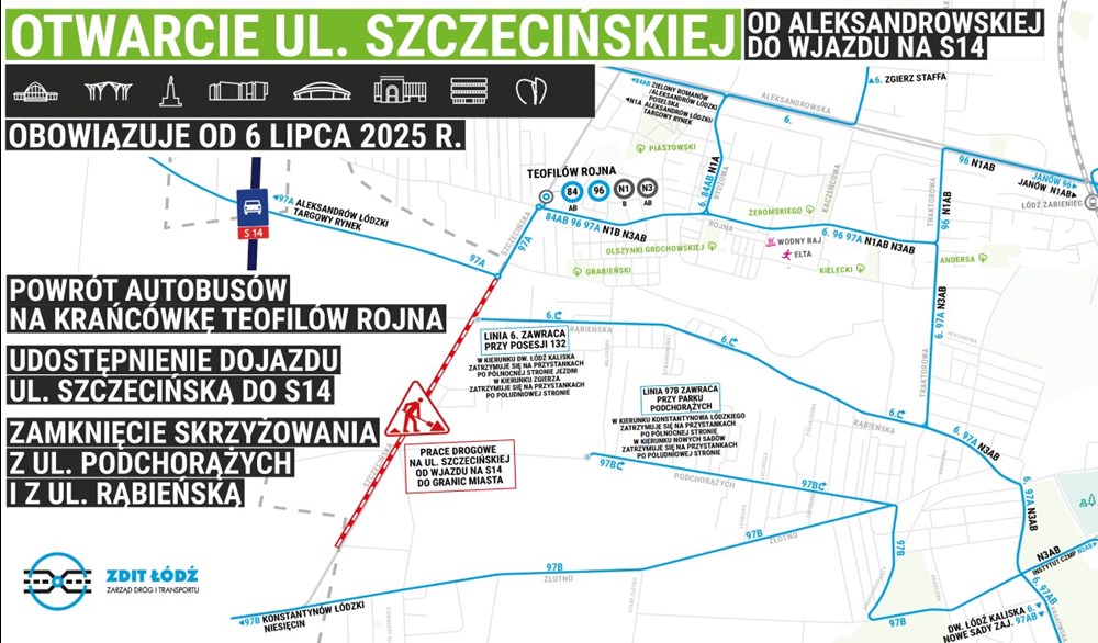 Również od 6 lipca zamknięta zostanie ul. Szczecińska na odcinku wjazdu na drogę S14 do granicy z Konstantynowem Łódzkim. Wiąże się to również z zamknięciem skrzyżowań z ulicami Rąbieńską i Podchorążych. Wspomniane ulice nie pozostaną jednak bez obsługi transportem publicznym. Zarząd Dróg i Transportu zdecydował, że autobusy zawrócą na tymczasowych zawrotkach przed ul. Szczecińską. Będzie to swego rodzaju wjazd kieszeniowy. Zmiany dotyczyć będą linii 97A, 97B i 6 MUK.