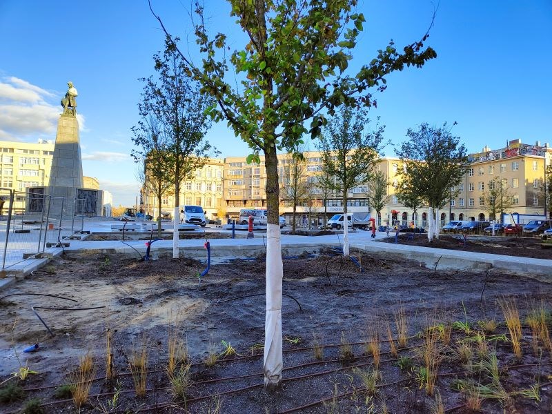 Wykonawca prowadzi też prace wykończeniowe i sadzi kolejne drzewa, których na placu ma być łącznie 64 (54 wiązy i 10 grusz). Zaplanowano też posadzenie na płycie placu kilku tysięcy krzewów: hortensji, wierzb purpurowych i laurowiśni wschodnich. Całości dopełnią byliny i trawy ozdobne.