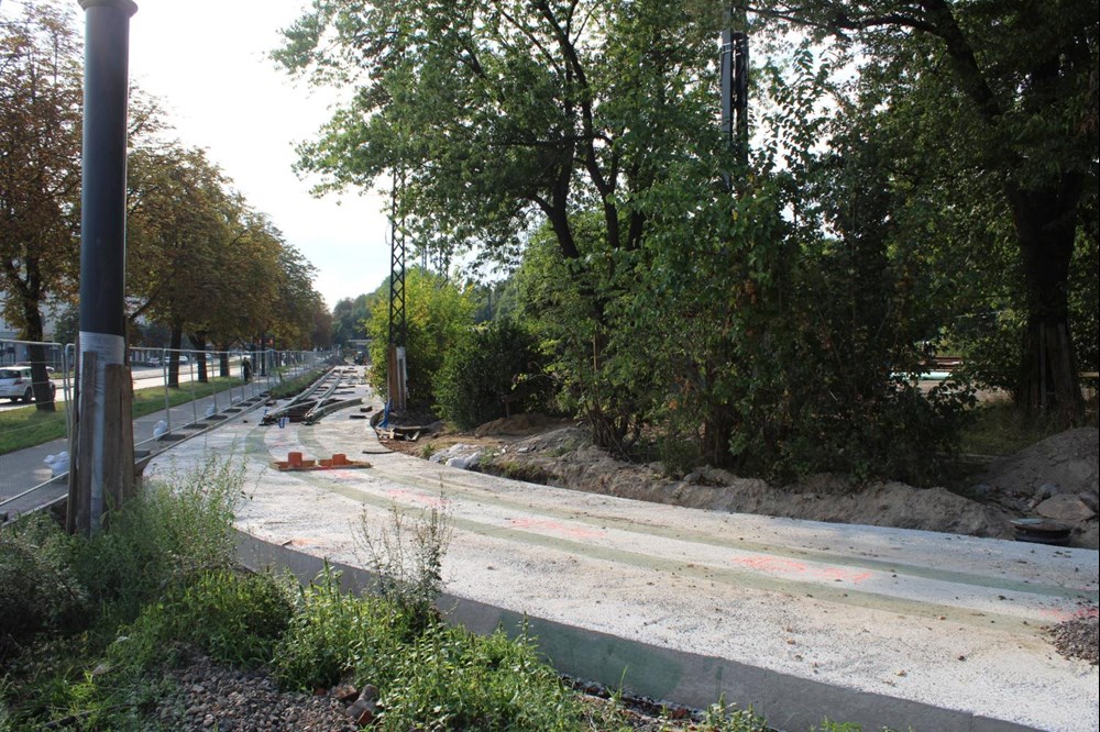 Wymienionych prac torowych nie udało się natomiast jeszcze przeprowadzić bliżej wyjazdu z krańcówki. Tam trwa wzmacnianie konstrukcji kanału rzeki Łódki oraz zakrywanie fundamentów odkrytej niedawno kamienicy z dawnej zabudowy Starego Miasta.