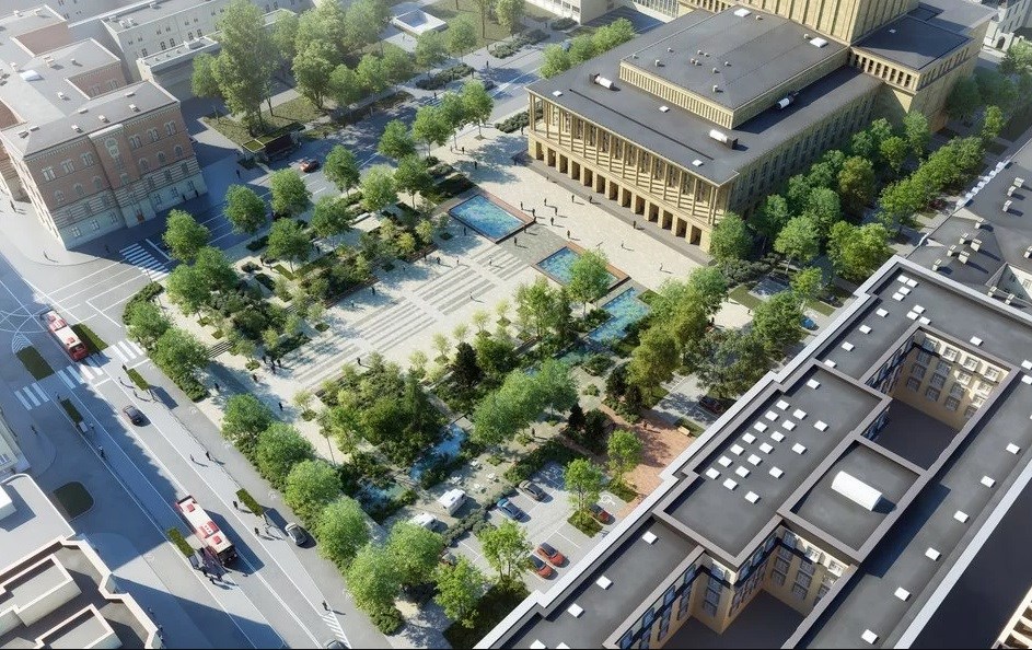 Po obu stronach placu (od strony sądu i Collegium Anatomicum) mają pojawić się szpalery dużych drzew. Dodatkowo spora przestrzeń zieleni będzie od strony ul. Narutowicza. Centralna część pozostawiona ma być jako wolna, utwardzona przestrzeń, z zachowanym centralnym widokiem na Teatr Wielki, który widoczny będzie wciąż aż z Dworca Fabrycznego. Nowy zbiornik wodny naprzeciwko teatru podzielony będzie na dwie części z przejściem pośrodku.