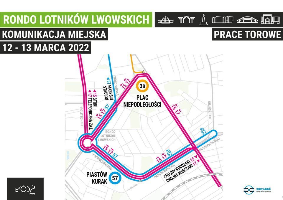 Zmiany MPK Łódź na rondzie Lotników Lwowskich w weekend 12-13 marca:Zmianie ulegnie trasa linii 3B, 15 i 17 oraz linii 57 która stanowić będzie dodatkowe połączenie na ul. Paderewskiego.