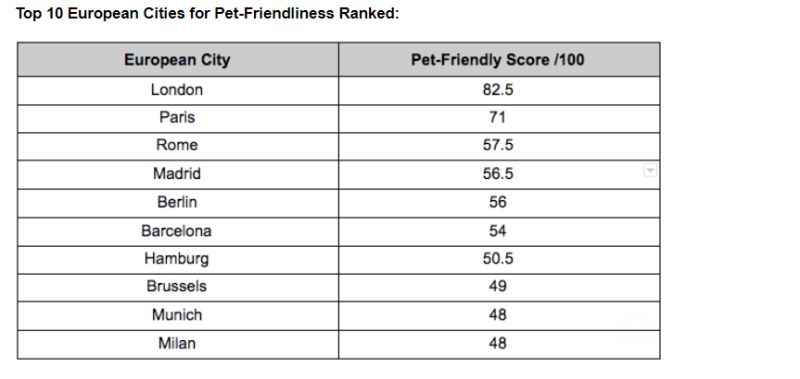 Londyn zajął pierwsze miejsce na liście wśród miast Europy najbardziej przyjaznych dla zwierząt ze względu na tereny zielone, sklepy zoologiczne i sieć transportu publicznego. Stolica Anglii zdobyła w sumie 82,5 punktów na 100 możliwych. Na drugim miejscu znalazł się Paryż, który w raporcie uzyskał 71 punktów. Stolica Francji pozycję wicelidera zawdzięcza głównie 163 parkom dla zwierząt. Podium uzupełnia Rzym. Stolica Włoch zgromadziła łącznie 57,5 punktów, oferując 39 zakładów pielęgnacyjnych i 129 sklepów zoologicznych, w których można kupić wszystkie niezbędne produkty dla czworonogów.