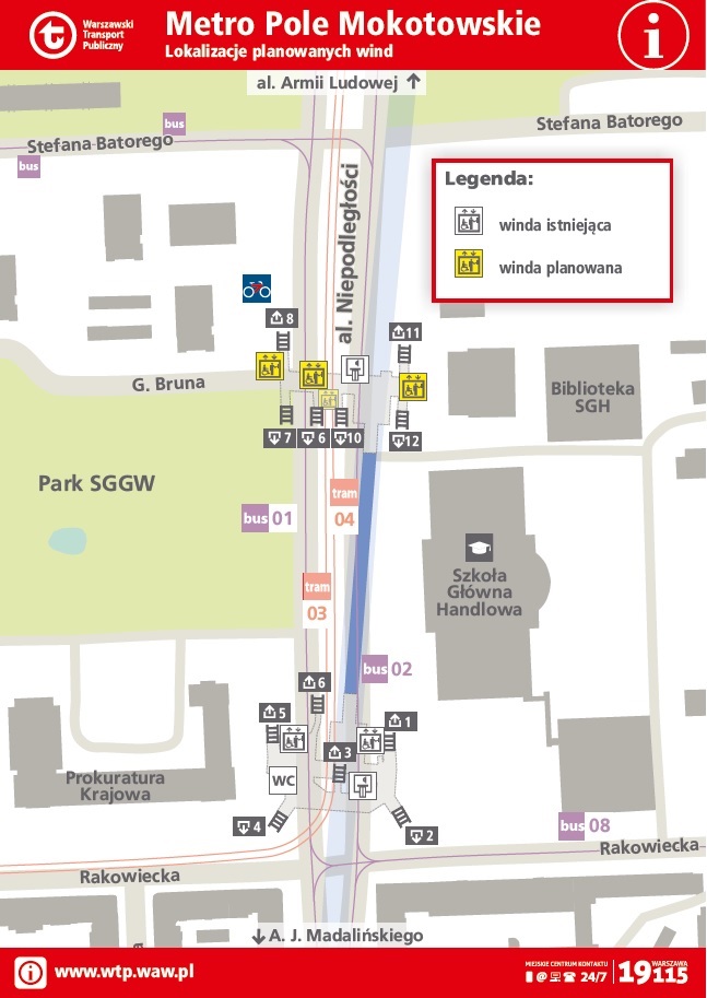 Warszawski ZTM podpisał umowę z firmą ILF na dokumentację projektowo-kosztorysową dla czterech nowych wind na głowicy północnej stacji Pole Mokotowskie. Trzy z nich miałyby łączyć poziom terenu z antresolą, a jedna – halę odpraw z peronem.
