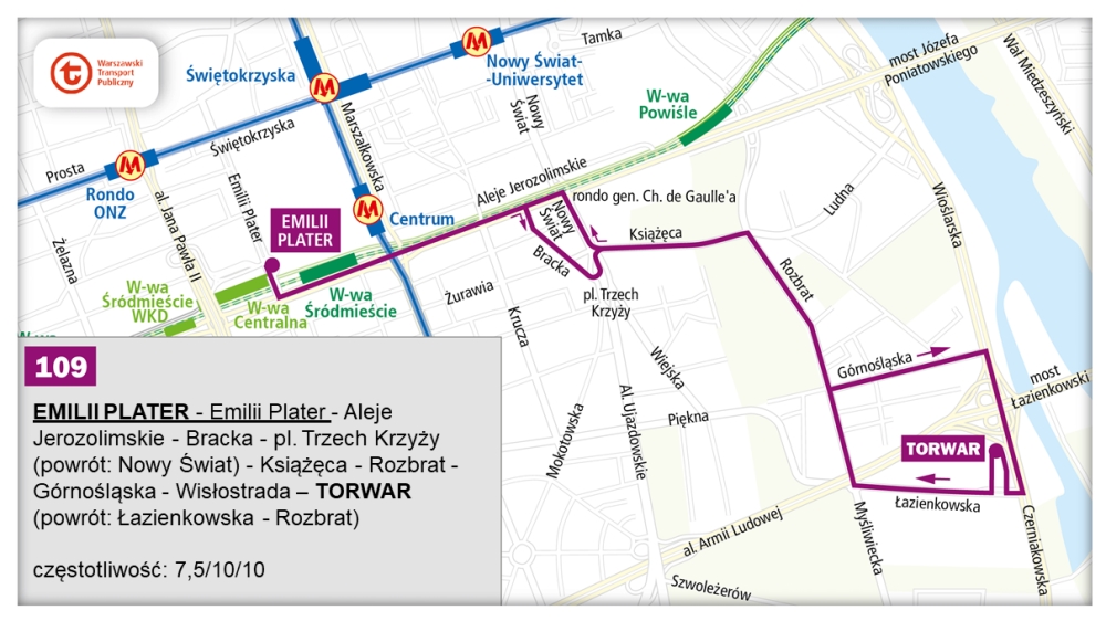 109: EMILII PLATER – Emilii Plater – Aleje Jerozolimskie – Bracka – pl. Trzech Krzyży (powrót: Nowy Świat) – Książęca – Rozbrat – Górnośląska – Wisłostrada – TORWAR (powrót: Łazienkowska – Rozbrat).