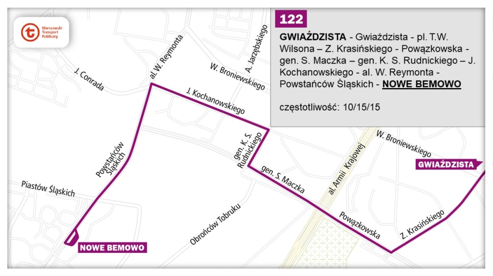 122: GWIAŹDZISTA – Gwiaździsta – pl. T.W. Wilsona – Z. Krasińskiego – Powązkowska – gen. S. Maczka – gen. K. S. Rudnickiego – J. Kochanowskiego – al. W. Reymonta – Powstańców Śląskich – NOWE BEMOWO