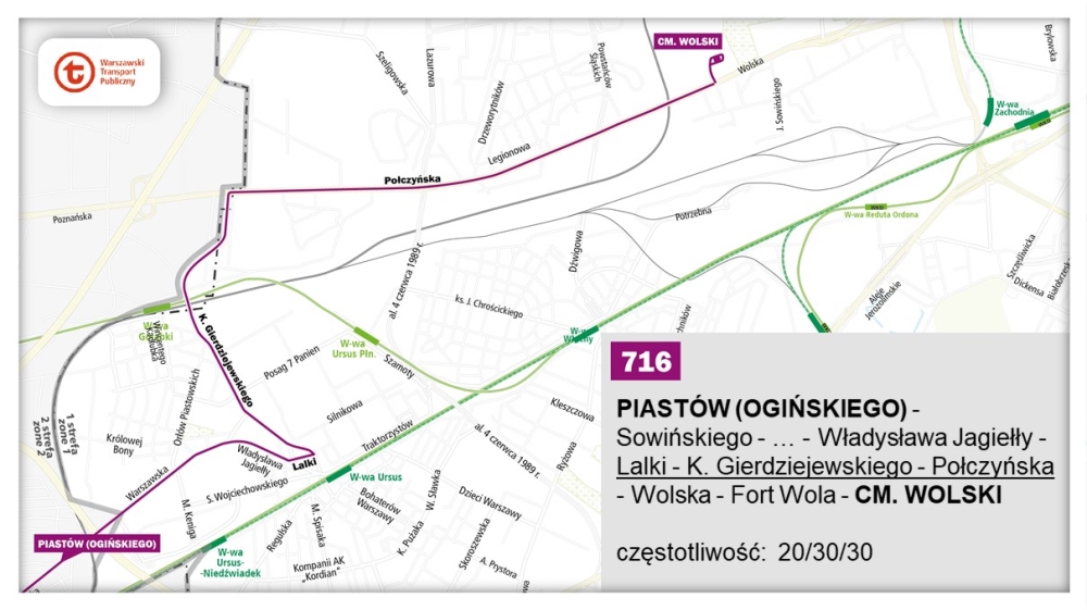 716: PIASTÓW (OGIŃSKIEGO) – Sowińskiego – Wojska Polskiego – Warszawska – Władysława Jagiełły – Lalki – K. Gierdziejewskiego – Połczyńska – Wolska – Fort Wola – CM. WOLSKI