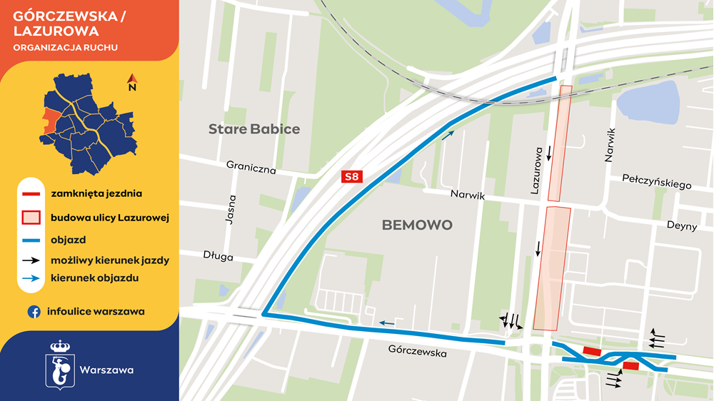Najpierw jezdnią południowąWe wtorek, 1 sierpnia, o godzinie 22:00 drogowcy przekierują ruch w obu kierunkach na jezdnię południową ulicy Górczewskiej. Na całej długości – czasowo zamkniętej – pętli autobusowej, kierowcy pojadą dwoma pasami w każdą stronę. Podróżujący w stronę Lazurowej na tym odcinku będą poruszali się „pod prąd”. Zjadą na sąsiednią jezdnię na wysokości wjazdu, a na właściwą nitkę powrócą przy wyjeździe z pętli. Wlot drogi wewnętrznej – prowadzącej w stronę ulicy Deyny – zostanie zamknięty. Dojazd dla mieszkańców będzie możliwy ulicą Narwik od strony Lazurowej lub Pełczyńskiego.