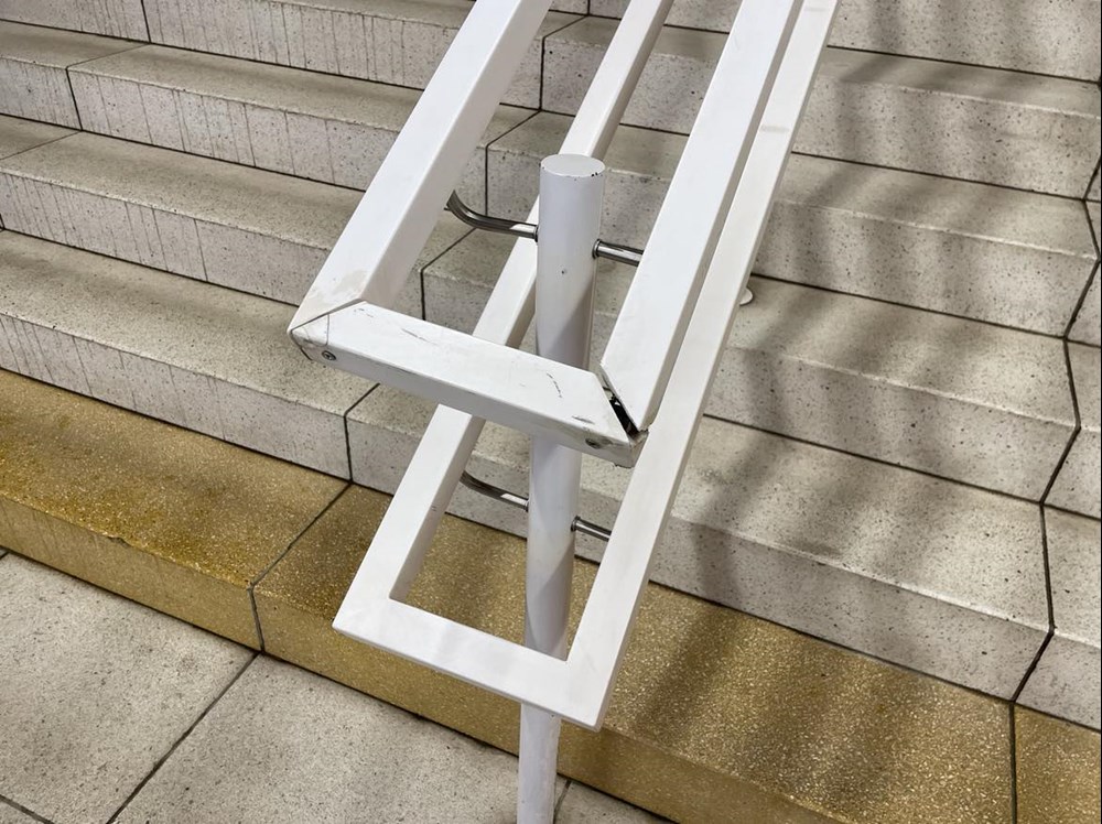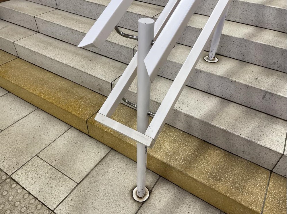 pękanie płyt posadzkowych z lastryka. Tu wykonawca rozpoczął już uzupełnianie ubytków. Do naprawy zgłoszono już uszkodzenia barierek – odbarwionymi, z luźnymi elementami poręczy.