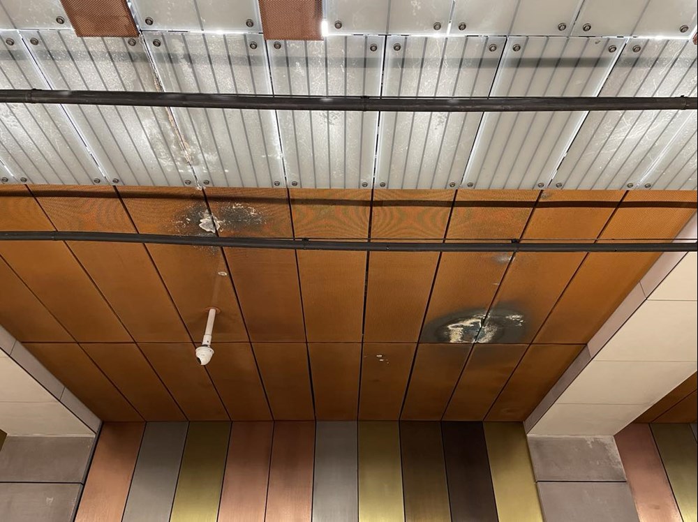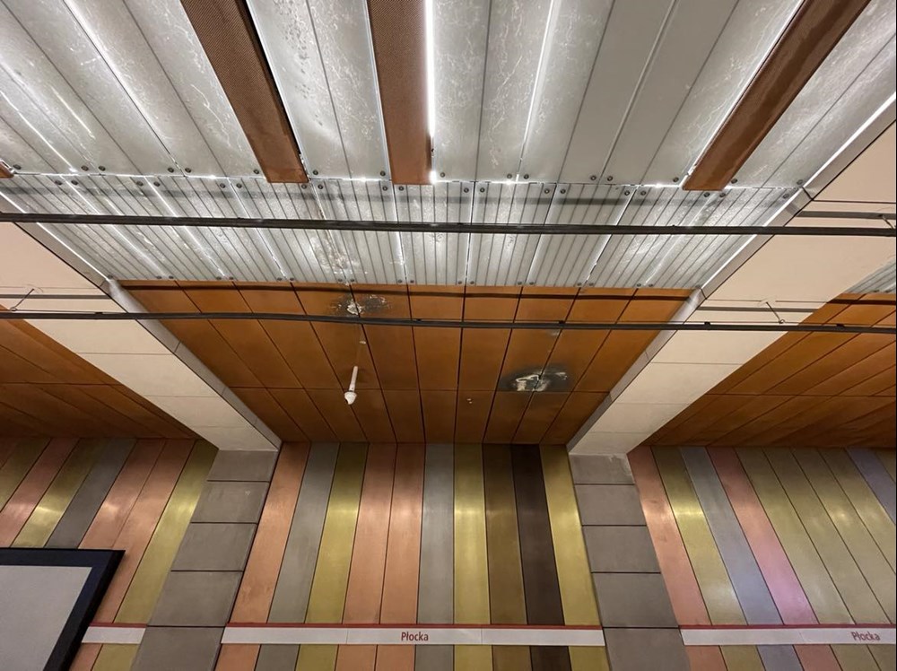 W niektórych miejscach jednak miedziane panele sufitowe odbarwiają się od wody. – Przebarwienia pojawiają się w miejscach, gdzie występują przecieki w konstrukcji żelbetowej obiektu. Przecieki są zjawiskiem powszechnie występującym w obiektach podziemnych w miejscach wysokiego nawodnienia ośrodka gruntowego. Usterki z tym związane są każdorazowo zgłaszane są do wykonawcy zgodnie z procedurami obowiązującymi w okresie rękojmi, który dokonuje napraw. Zawilgocenia i przebarwienia, które w związku z powyższym pojawiają się na panelach sufitowych także są usuwane przez wykonawcę w ramach obowiązków wynikających z rękojmi – informuje Bartoń.