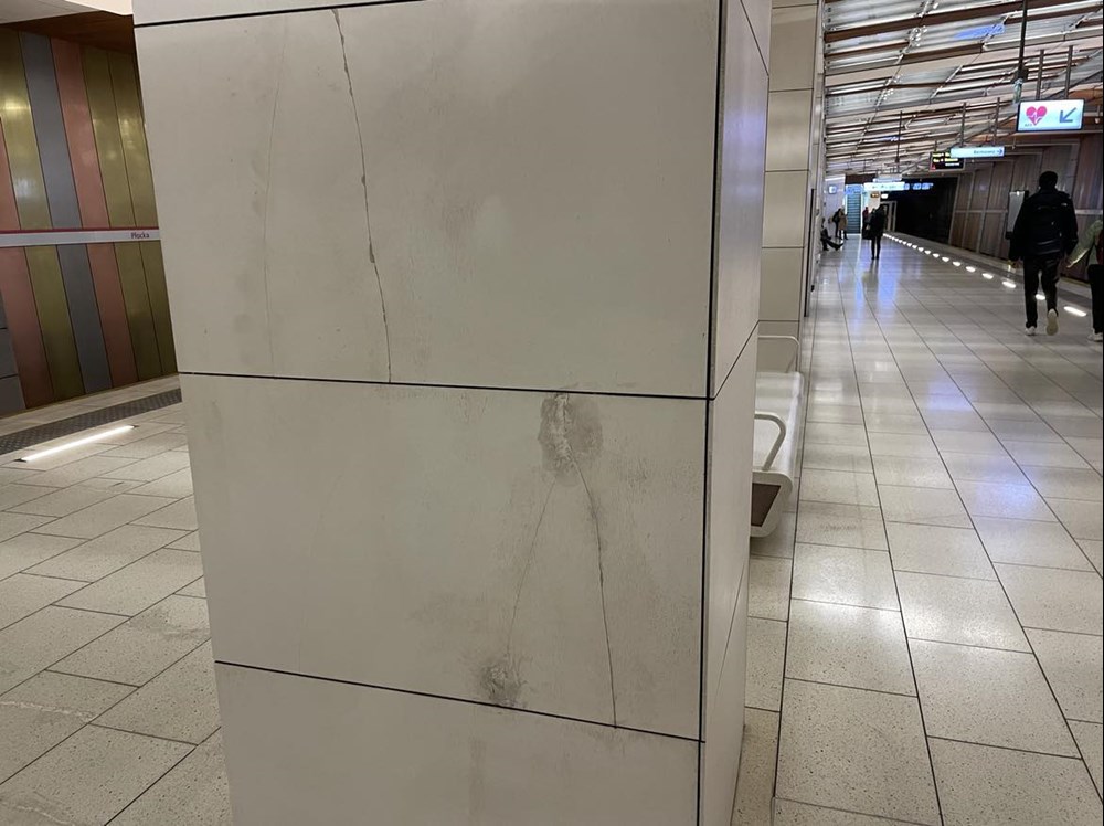 Dużo problemów sprawiają też białe okładziny kolumn i ścian – wykonane z konglomeratu i zamocowane na ruszcie. Niestety, w wielu miejscach są spękane. Do tego na ścianach zatorowych szybko pokryły się kurzem – podejmowane próby czyszczenia jak dotąd kończyły się niepowodzeniem i odbarwieniami. – Cała ściana zatorowa jest cyklicznie myta, jednakże pionowe jasne elementy szybko zszarzały od kurzu. W porównaniu do pozostałych paneli mają powierzchnię, do której łatwo przylegają zabrudzenia w tym przypadku związane z ruchem pociągów. Firma sprzątają podejmie próbę umycia tych elementów bardziej inwazyjną metodą – deklaruje Anna Bartoń, rzeczniczka Metra Warszawskiego.
