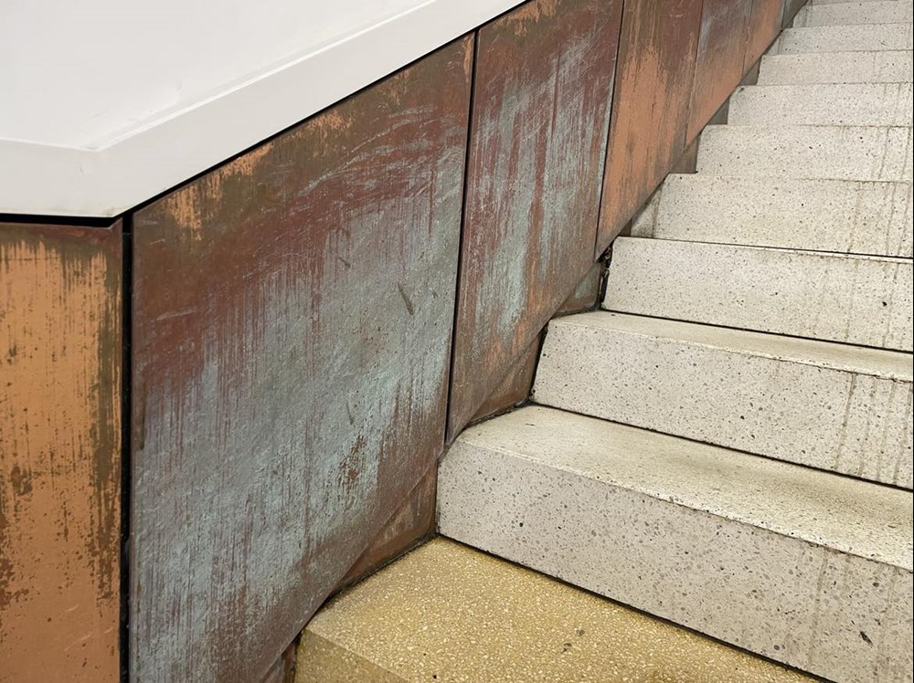 Uwagę przyciągają też miedziane panele. Miejscami odbarwione, a miejscami ze zdartą powłoką. Metro Warszawskie przekonuje jednak, że to proces oczekiwany. – Proces patynowienia okładzin ściennych na stacji metra Płocka w postaci miedzianych blach jest procesem, który przebiega w sposób naturalny. Patyna powstaje na wszystkich powierzchniach miedzianych, które są narażone na działanie warunków atmosferycznych. Jest zjawiskiem naturalnym, a nawet pożądanym – tworzy warstwę ochronną, która zabezpiecza przed dalszą korozją – informuje Bartoń. Jak wskazuje, to proces „złożony, niejednorodny i długotrwały”, a ostateczne efekty mogą być widoczne po kilku latach. Patyna na miedzi finalnie przyjmuje różne kolory – od jasnozielonego po szarozielony.