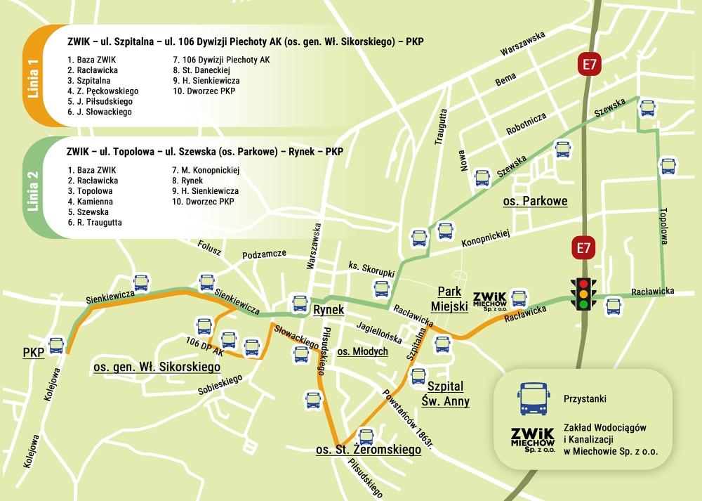 W oparciu o umowę podpisaną w dniu 21 września 2020 r. operatorem komunikacji będzie Zakład Wodociągów i Kanalizacji w Miechowie. Autobusy elektryczne kursować będą na trasie ZWiK – Dworzec PKP w obu kierunkach. Trasa linii nr 1 rozpoczyna się na przystanku zlokalizowanym przy bazie ZWIK i przebiega przez ulice: Racławicka, Szpitalna, Z Pęckowskiego, J. Piłsudskiego, J. Słowackiego, 106 Dywizji AK (os. Gen. Wł. Sikorskiego), St. Daneckiej, H. Sienkiewicza, kończąc na przystanku: Dworzec PKP. Trasa 2 obejmie przystanki przy ZWiK oraz ulice: Racławicka, Topolowa, Kamienna, Szewska (os. Parkowe), Traugutta, Konopnickiej, Rynek, Sienkiewicza, Dworzec PKP.