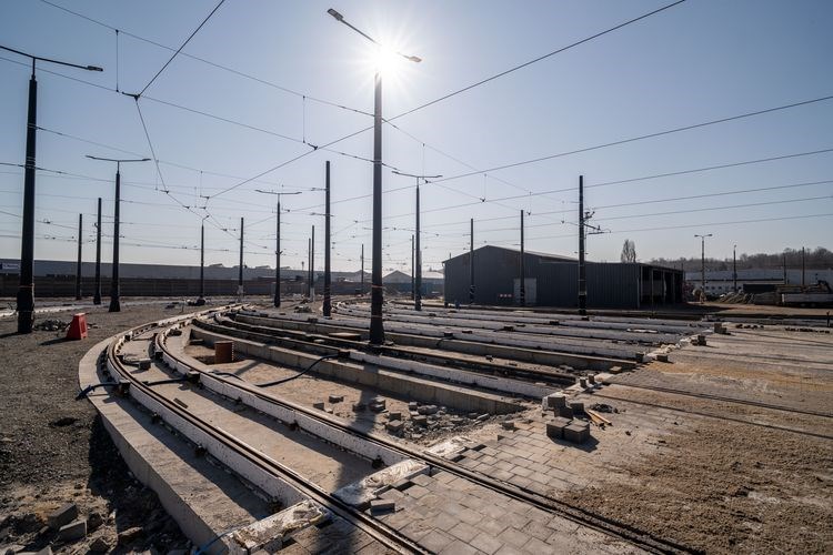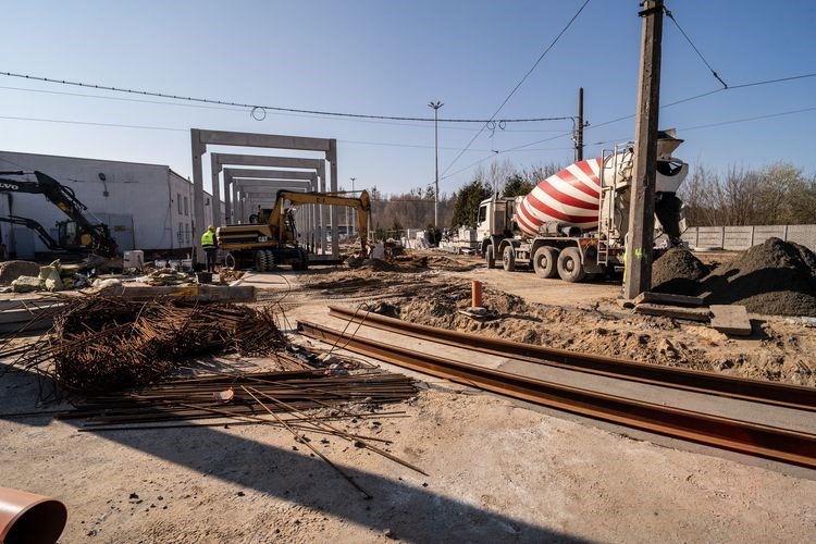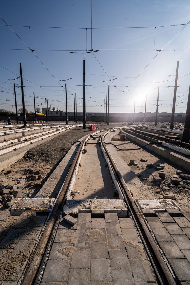 Zaawansowanie rzeczowe robót wynosi prawie 50 procent. Zakończyły się m.in. prace przy harfie (zespole rozjazdów we wschodniej części zajezdni). Wykonane zostanie jeszcze zabudowa torów. Na tym etapie przestrzenie pomiędzy torami i zabudową będą zalewane specjalnymi żywicami, które zapewniają elastyczne i trwałe połączenie metalu i betonu.