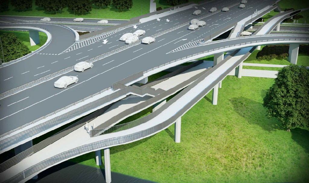 mat. ZDM WarszawaZgodnie z koncepcją przygotowaną przez Transprojekt-Warszawa pod przeprawą zostaną zawieszone dwie kładki, z obu stron mostu, które będą łączyć się z istniejącymi drogami rowerowymi na Cyplu Czerniakowskim i wzdłuż Wału Miedzeszyńskiego. Ponadto, jak zapowiada ZDM, zachowana zostanie również rezerwa pod ewentualną przyszłą rampę pozwalającą dostać się na plaże i ścieżkę rekreacyjną na praskim brzegu Wisły. Nachylenia kładki nie przekroczą 6-7%. Jej szerokość wyniesie 3,4 m.