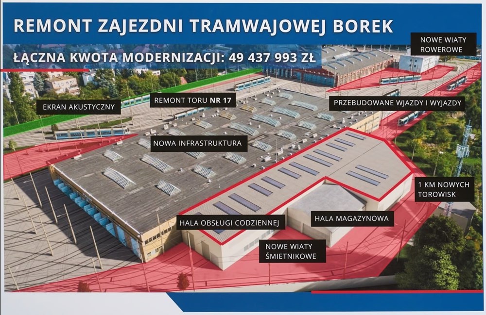 Grafika przedstawia zmodernizowane elementy zajezdni Borek (fot. MPK Wrocław)