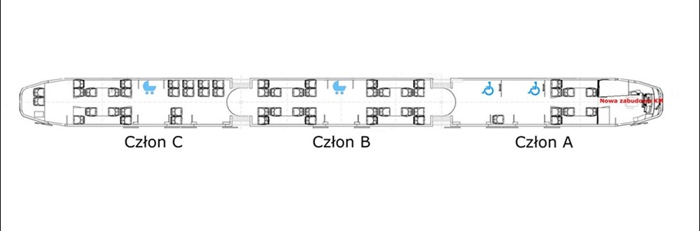 Ponadto MPK chce też nieco przebudować wnętrza wozów - w członie A ma pojawić się drugie miejsce dla osób poruszających się na wózkach poprzez montaż tzw. deski i pasów, do tego człon B ma zostać dostosowany do przewozu wózka dziecięcego poprzez demontaż dwóch foteli naprzeciwko IV drzwi oraz przesunięcia wygrodzenia. W trzecim członie z kolei także ma pojawić się miejsce na wózek poprzez demontaż dwóch foteli znajdujących się naprzeciwko VI drzwi a jednocześnie MPK chce dołożyć drugi rząd foteli do czterech siedzeń po lewej stronie pojazdu oraz dołożyć drugi rząd do fotela pomiędzy V a VI drzwiami. Nowy układ wnętrza tramwajów pokazano na rysunku poniżej.