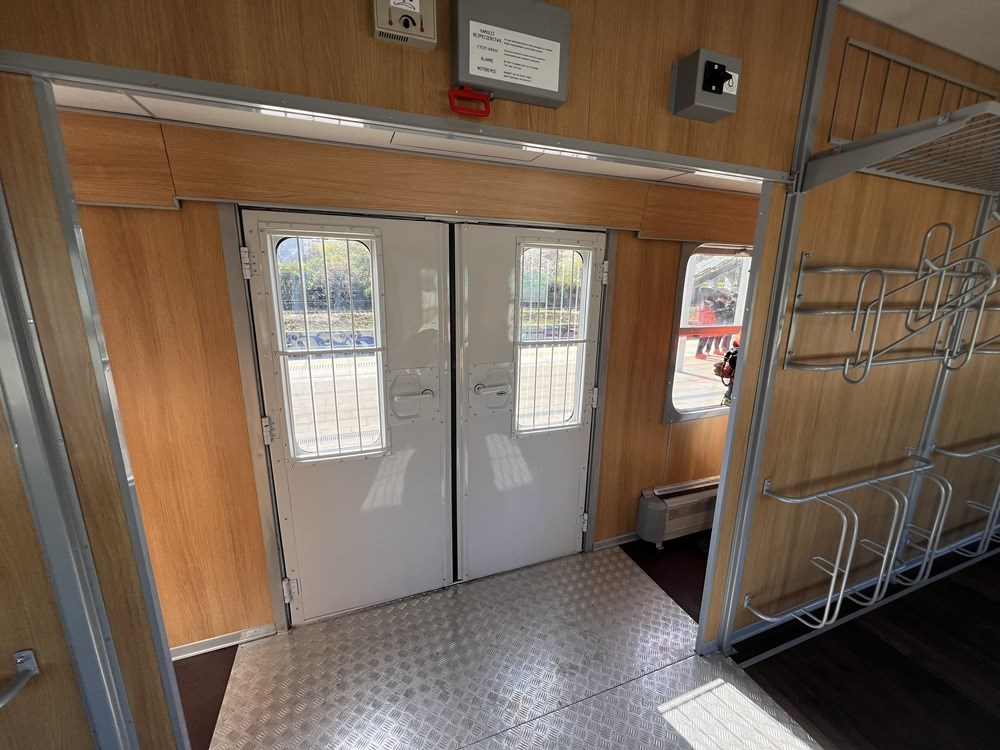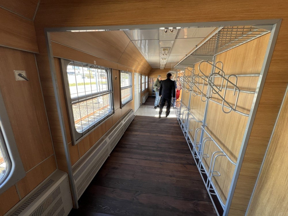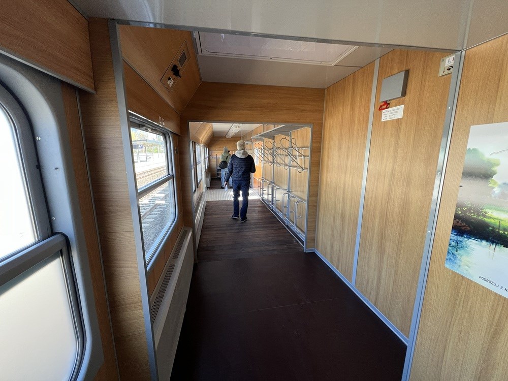 Jeden z nich został odświeżony na potrzeby składu retro i prezentuje się bardzo ciekawie. W środku znajdziemy więc odrestaurowane, podwójne drzwi ładunkowe w środku wagonu, a także gruntownie odnowione wieszaki na rowery oraz półki na bagaże nad hakami. Wieszaków jest łącznie 18, choć nie oznacza to, że to właśnie tyle rowerów będzie można przewieźć w Nieśpiesznym - o tym szerzej niżej.