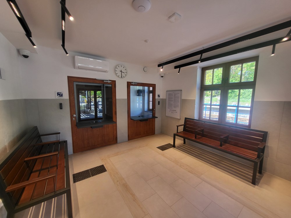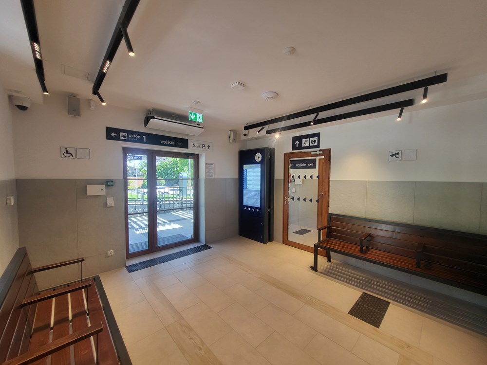 Metamorfozę przeszła także przestrzeń obsługi podróżnych. Posadzkę holu wykończono płytkami imitującymi drewno i kamień, tworzącymi geometryczny wzór. Ściany do wysokości lamperii obłożono wielkoformatowymi panelami gresowymi w kolorze szarym, a powyżej pomalowano na biało. Oświetlenie wykonano w formie reflektorów na szynie. We wnętrzu holu-poczekalni umieszczono tablicę z rozkładem jazdy pociągów, ławki, kosze, gabloty oraz defibrylator. W sąsiedztwie holu znajdują się toalety dla podróżnych. Na parterze budynku zlokalizowano także lokal handlowo-usługowy. Natomiast na zewnątrz pod wiatą przewidziano miejsca dla automatu z przekąskami i biletomatu.