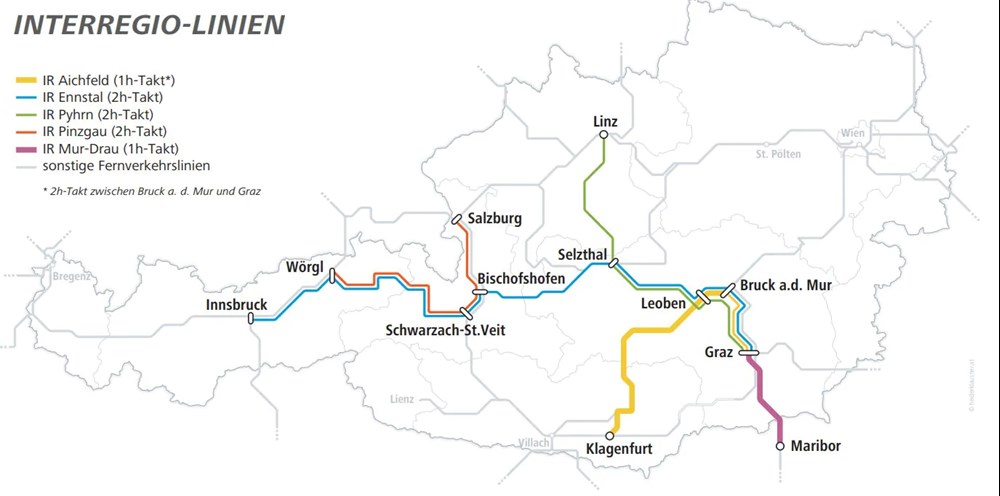 Od tegorocznej grudniowej zmiany rozkłady jazdy w Austrii pojawi się nowa kategoria pociągów – Interregio. Jej uruchomienie przez austriackie koleje federalne ÖBB (niem. Österreichische Bundesbahnen) jest związane po części z nadchodzącym udostępnieniem dla przewozów pasażerskich tunelu Koralm. Stanowi on kluczowy i najbardziej spektakularny fragment Koralmbahn, czyli linii kolejowej pomiędzy Grazem a Klagenfurtem, która zapewni skrócenie czasu przejazdu pomiędzy tymi miastami z blisko 3 godzin do zaledwie 45 minut. Austriacy chcą utrzymać solidną ofertę przewozową pomiędzy tymi miastami na dotychczas wykorzystywanej linii kolejowej przez Bruck an der Mur. Pociągi na linii IR Aichfeld z Klagenfurtu do Bruck an der Mur przez Leoben będą więc jeździły w takcie 60-minutowym. Co drugi pociąg będzie kursował w relacji wydłużonej do Grazu.