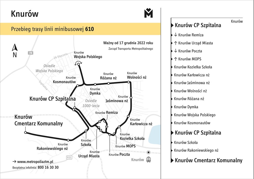 W Knurowie, na wniosek prezydenta Adama Ramsa, uruchomiona zostanie linia 610. Jej trasa przebiegać będzie drogą okrężną od Centrum Przesiadkowego Szpitalna do Cmentarza Komunalnego. Z połączeń będą mogli korzystać m.in. mieszkańcy z dotąd pomijanych przez autobusy ulic Jęczmiennej i Księdza Alojzego Koziełka. – Współpraca pomiędzy samorządem Knurowa a Zarządem Transportu Metropolitalnego przebiega konstruktywnie i sprawnie, czego efektem jest uruchomienie nowej linii 610. Na uznanie zasługują także inne działania, jak np. modernizacja wiat przystankowych na terenie całej gminy, czy choćby dostosowywanie rozkładów jazdy na potrzeby wydarzeń miejskich. Nowa linia autobusowa spełni oczekiwania mieszkańców Knurowa, ułatwiając im komunikację w samym mieście, jak również na terenie całej Górnośląsko-Zagłębiowskiej Metropolii – mówi prezydent Knurowa Adam Rams.