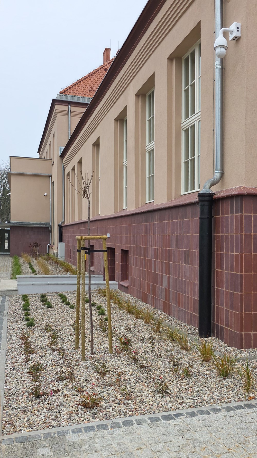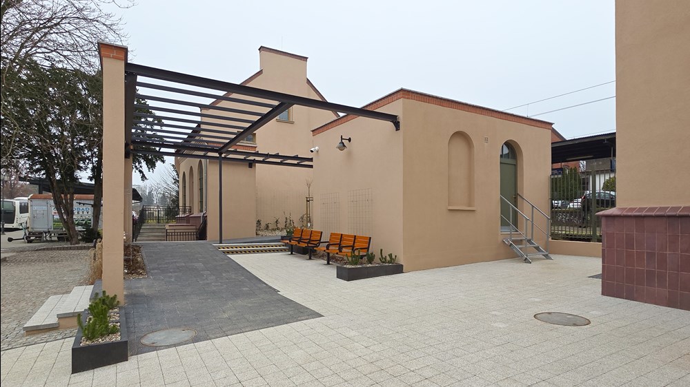 W ramach właśnie zakończonych prac budowlanych dworzec odzyskał swój dawny wygląd. Elewacja budynku zyskała beżowy odcień, który harmonijnie współgra z białą stolarką okienną i drzwiową w części dworcowej oraz brązową w sąsiednich budynkach kompleksu. Obiekt nie jest więc w pełni biały, jak początkowo zakładano w projekcie – zmiana nastąpiła na etapie ustalenia historycznego wyglądu dworca. W toku badań konserwatorskich odkryto różne warstwy farby i ustalono pierwotny wygląd dworca. Nad głównym wejściem, od strony miasta, umieszczony został okrągły, tradycyjny zegar. W ramach inwestycji częściowo rozebrano budynek (pozostawiono jedynie mur) położony pomiędzy dworcem a tzw. starą apteką, w którego miejscu urządzono poczekalnię letnią. W nowej przestrzeni znalazła się pergola obsadzona roślinami pnącymi oraz nowe elementy małej architektury, takie jak ławki i kosze. To jednak nie wszystko – w tej części znalazł się również niewielki obiekt na instalacje telekomunikacyjne, które służą obsłudze ruchu pociągów.