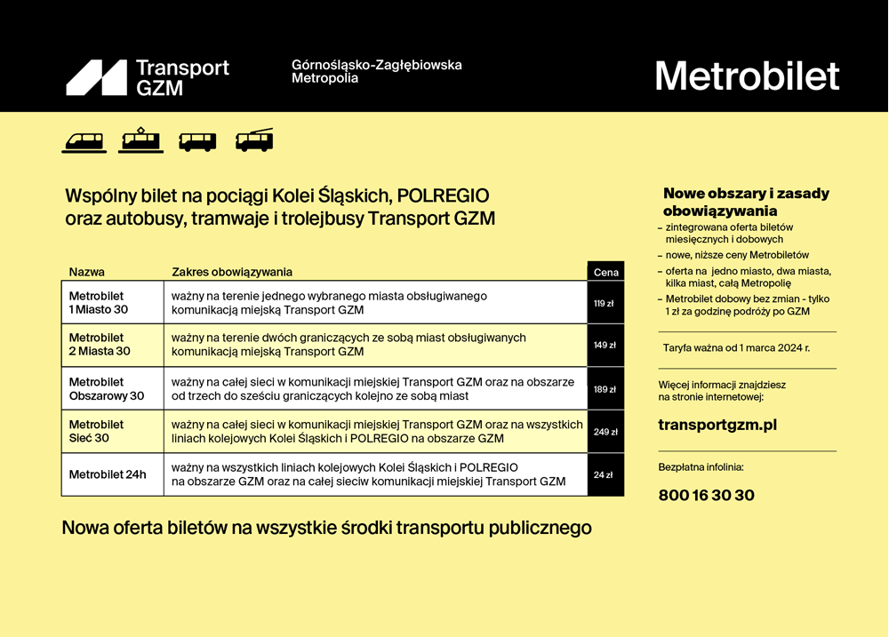 Od 1 marca 2024 r. cena biletu 30-dniowego ważnego na terenie 1 miasta wynosić będzie 119 zł. Zmiana ceny (o 10 zł) wynika ze wzrostu kosztów organizacji publicznej, szczególnie cen energii i wynagrodzeń. Jednak dzięki porozumieniu podpisanemu z samorządem województwa śląskiego pasażerowie w cenie biletu zyskają możliwość poruszania się również koleją.