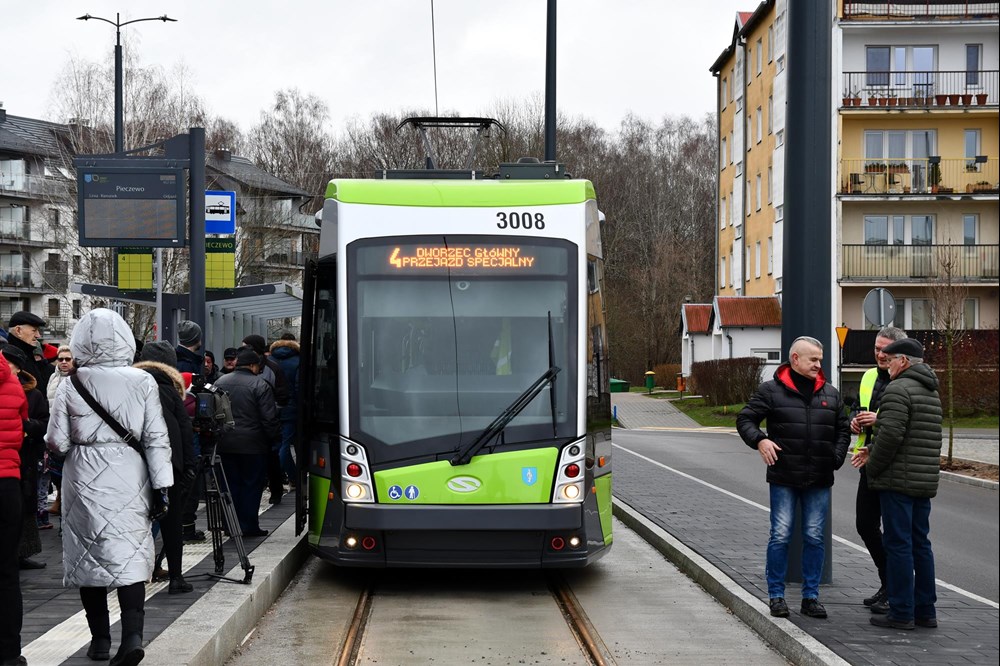 Osiem lat od uruchomienia tramwajów w Olsztynie miasto otwiera pierwsze przedłużenie sieci. Do kursujących trzech linii dołączyła właśnie czwarta, która połączyła osiedle Pieczewo z głównym dworcem kolejowym. Pierwszy tramwaj ruszyl punktualnie o godz. 11:15 w sobotę 30 grudnia. Wkrótce w pierwszy kurs wyjedzie także tramwajowa „piątka”.