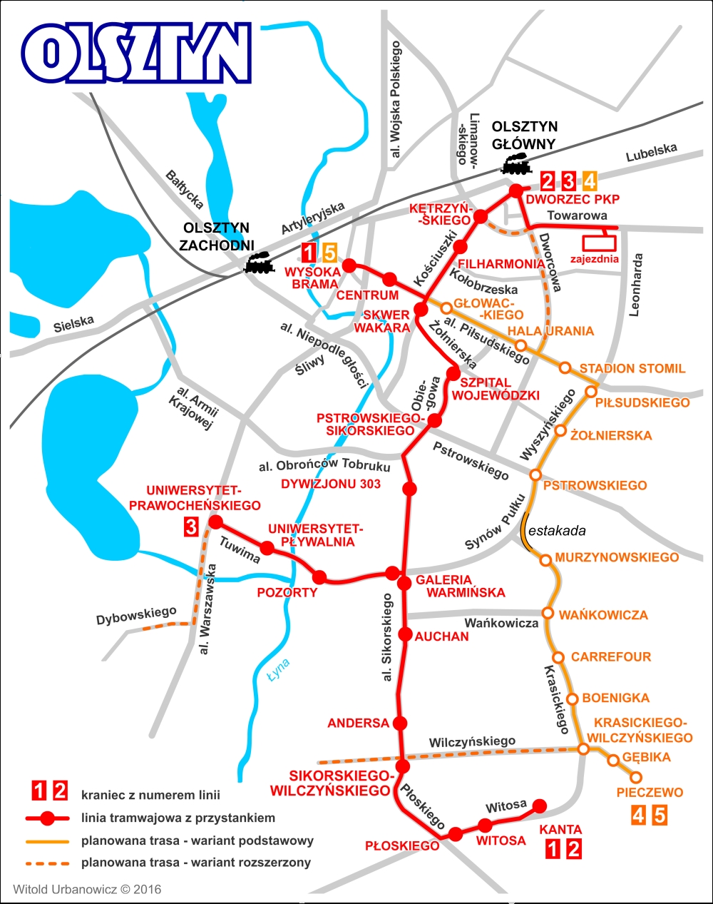 Kierunki rozbudowy olsztyńskiej sieci tramwajowej, widoczne opisywane odcinki - na Wilczyńskiego oraz do Uniwersytetu. Na mapie nie ma za to trasy na Zatorze