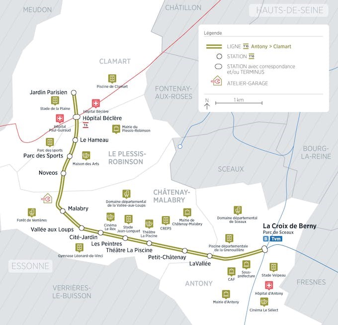 Przesiadka na linię tramwajową T6 będzie możliwa na Hôpital-Béclère, drugim przystanku w mieście Clamart, natomiast przystanek końcowy La-Croix-de-Berny umożliwi transfer do linii B kolei miejskiej RER oraz linię autobusową TVM, dla której jest to również przystanek końcowy.