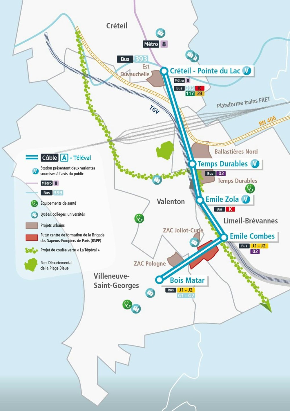 Kolej gondolowa, oznaczona C1, przebiega między Villeneuve-Saint-Georges i Créteil, przez Limeil-Brévannes i Valenton, zapewniając dogodny dojazd do metra.