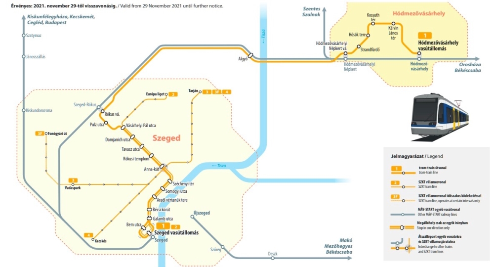 Pierwszy tramwaj odjechał punktualnie w poniedziałek 29 listopada o godz. 3:31 z Hódmezővásárhely. Odjazdy z Hódmezővásárhely odbywają się co godzinę do godz. 23:31, a z pętli Szeged pályaudvar w godz. 4:38-23:38 również w takcie godzinnym. Do 15 kwietnia przejazdy będą bezpłatne.
