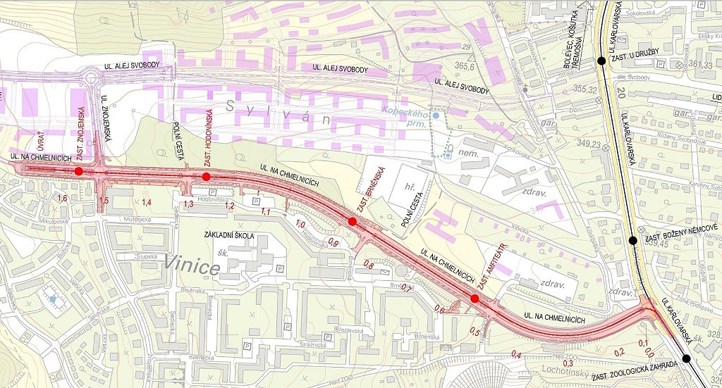 Długość nowej trasy wyniesie 1,5 km. Torowisko będzie odchodzić od istniejącej linii tramwajowej w rejonie przystanku Zoologická zahrada i prowadzić między jezdniami ul. Na Chmelnicích. Kraniec dla tramwajów dwukierunkowych zaplanowano za skrzyżowaniem z ul. Znojemską. Przewidziano cztery nowe przystanki. – Przebudowana zostanie ul. Na Chmelnicích, gdzie pojawią się miejsca parkingowe zieleń, drogi rowerowe i chodniki po obu stronach ulicy. Drugi kraniec linii nr 3 znajdzie się na Mikulášské náměstí – zawracanie tramwajów jest możliwe poprzez ulice Sladkovského i Radyňską. W tym celu przebudowana zostanie ul. Radyňska. Za szkołą powstanie tor postojowy, by tramwaje linii 2 i 3 mogły się swobodnie mijać.