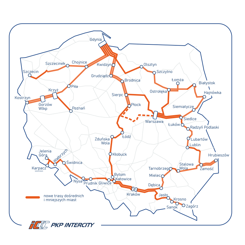 Pociągi PKP Intercity mają też obsługiwać zupełnie nową relację dalekobieżną: Białystok – Gdynia przez Olsztyn, Szczytno, Chorzele, Ostrołękę, Śniadowo oraz Łapy. Do tego trasa z Gdyni do Krakowa przez Sztum, Grudziądz, Rypin, Płock, Gostynin, Łódź, Kłobuck, Bytom i Katowice (dzięki temu pociągi dalekobieżne w końcu wrócą więc na ten odcinek magistrali węglowej). Grudziądz czy Rypin otrzymają także dogodne połączenia w kierunku stolicy kraju, w ramach kolejnej trasy z Gdyni do Warszawy, prawdopodobnie przez Raciąż i Płońsk lub też trasą przez Płock. Jak jednak zastrzegł prezes PKP Intercity, będzie to zależne od tego, jaką ofertę na obu trasach zaproponują Koleje Mazowieckie. Na razie jednak wydaje się, że hybrydy pojadą przez Płońsk.
