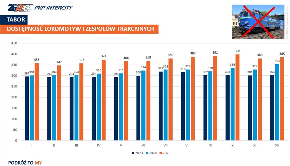 Jak informuje przewoźnik, na koniec grudnia 2025 roku spółka dysponowała 385 lokomotywami oraz zespołami trakcyjnymi zdolnymi do jazdy - dla porównania rok wcześniej liczba ta wynosiła 353 a w grudniu 2023 roku - 303 pojazdy.