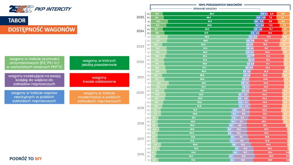 Spółka chwali się też coraz lepszym wskaźnikiem dostępności wagonów - aktualnie prawie 80% wagonów jest sprawnych. Reszta przebywa na zaplanowanych naprawach wyższych rzędów oraz modernizacjach. Kurczy się też wskaźnik trwale odstawionych wagonów, który osiągnął poziom 6,9% (w momencie obejmowania funkcji przez obecny zarząd było to… 17,6%).