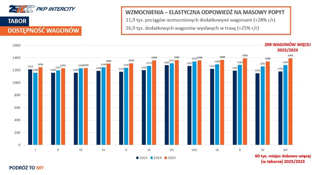 Zwiększa się również dostępność wagonów - na koniec grudnia Intercity miało 1391 wagonów gotowych do jazdy, a więc o ponad 200 więcej niż w grudniu 2023 roku.