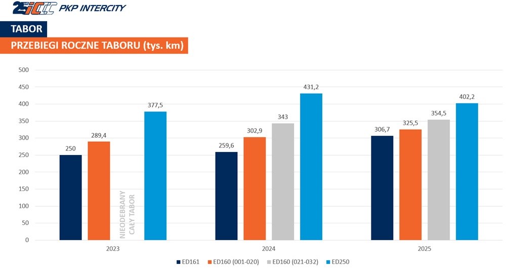 Intercity jeździ więcej - zarówno lokomotywami jak i zespołami trakcyjnymi. Na poniższej grafice widać, że roczne przebiegi EZT należących do IC znacznie wzrosły w stosunku do 2024 roku (poza Pendolino).