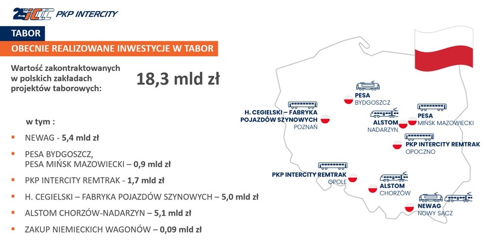 PKP Intercity podsumowuje ten wątek informując, że aktualnie polski przemysł realizuje umowy na tabor dla spółki o wartości 18,3 mld złotych (liczą się tutaj dostawy fabrycznie nowych pojazdów jak i naprawy i modernizacje już istniejących).