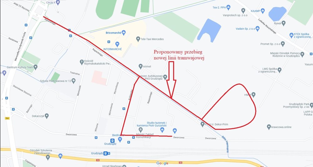Rzecznik prezydenta Grudziądza przesłał nam także planowany przebieg nowej linii tramwajowej w kierunku Rapackiego, który publikujemy poniżej.