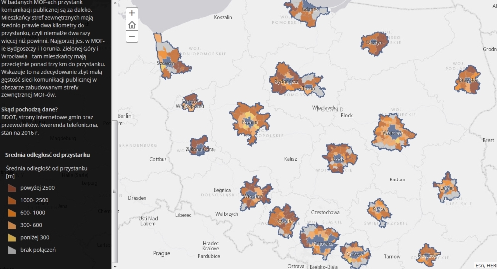 Odległe przystankiPrzeprowadzone badania wskazują, że w zasięgu pieszego dostępu do zbiorowego transportu publicznego, czyli przyjętym przez zespół Obserwatorium Polityki Miejskiej (powołany w KIPPiM dla stworzenia raportów) dystansie 640 m do przystanku autobusowego lub tramwajowego i 960 m dla przystanku kolejowego, zamieszkuje nieco ponad połowa ludności w strefach zewnętrznych MOF-ów ośrodków wojewódzkich. Średnia odległość do przystanku wynosi natomiast ponad 2 km.