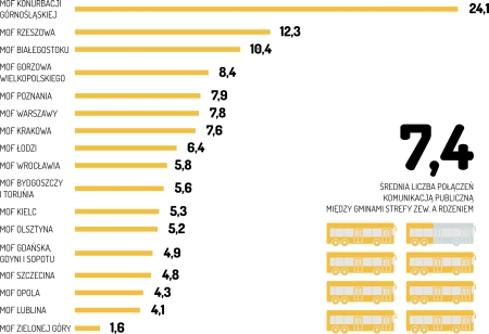 W ramach raportu zbadano również częstotliwość (par) połączeń między strefami podmiejskimi a miastem w ciągu doby, w przeliczeniu na tysiąc mieszkańców. Z największej liczby kursów komunikacji publicznej mogą się cieszyć mieszkańcy konurbacji górnośląskiej (24) oraz ośrodka rzeszowskiego (12). Jednak przeciętna częstotliwość dla wszystkich MOF-ów wynosi ok. 7 kursów dziennie na tysiąc mieszkańców, co nie stanowi dogodnej alternatywy dla podróży samochodem. Autorzy wyróżniają ośrodek białostocki. Jest on trzeci pod względem średniej liczby połączeń (10). Ale, co ważne, ilość połączeń jest podobna we wszystkich gminach strefy zewnętrznej MOF-u. Nie ma więc tutaj gmin lepszych i gorszych. Najmniej połączeń komunikacją publiczną jest w MOF-ie Zielonej Góry (1,6), w Lublinie (4,1) i Opolu (4,3).