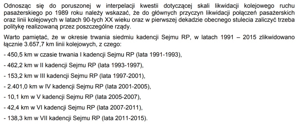 Odpowiedzi udzielił wiceminister Infrastruktury, Andrzej Bittel, wskazując, że w latach 1991-2015, w Polsce doszło do likwidacji (nie mylić z rozbiórką) niespełna 3658 kilometrów linii kolejowych. Co ciekawe, Bittel nie podał dokładnej liczby kilometrów linii kolejowych, jakie zostały zlikwidowane za rządów Zjednoczonej Prawicy, trwających od jesieni 2015 roku. Padło tylko ogólnikowe stwierdzenie o tym, że w czasie rządów PiS-u liczba kilometrów zlikwidowanych linii kolejowych była najmniejsza spośród poprzednich gabinetów od 1991 roku.